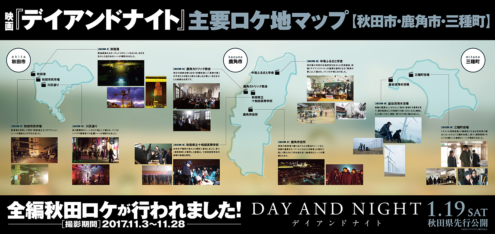 今回、映画「デイアンドナイト」の撮影で秋田県鹿角市、三種町でロケをさせて頂くことになりました。今年2月挨拶も兼ねてロケハンに行った際、自然が多く素敵な環境に撮影がとても楽しみになりました。撮影は早朝から深夜に及ぶこともありますが、皆様にご迷惑とならないよう、チーム一丸となり心に響く作品を完成させたいと思います。