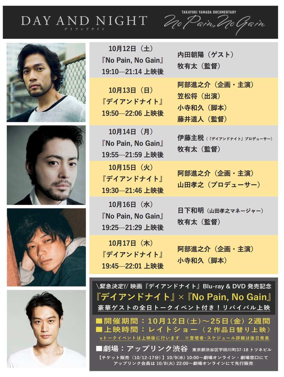 山田孝之・伊藤主税プロデュース作『DAY AND NIGHT』と、藤井道人監督・伊藤主税プロデューサーも出演する牧有太監督『山田孝之ドキュメンタリー No Pain, No Gain』のコラボトークイベントが決定しました!